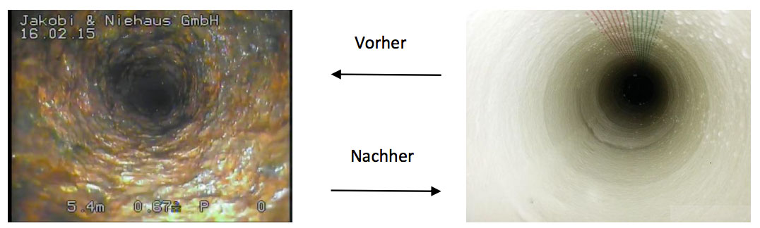 Im rechten Bild wurde über der stark inkrustierten Innenanwandung des Gussrohres im linken Bild ein Inliner angebracht. Wände im Innenbereich sind somit in Zukunft vor Feuchtigkeitsschäden geschützt.