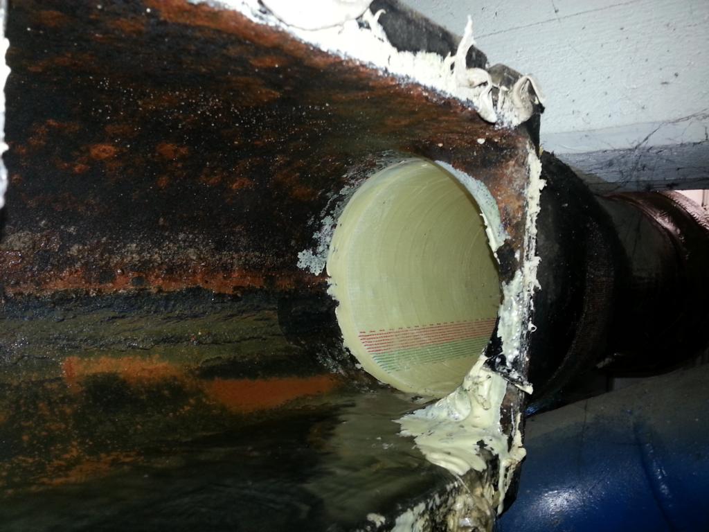 Im linken Bild lässt sich ein stark inkrustiertes Gussrohr von innen erkennen. Wie in diesem Beispiel, kann die alte Gußrohrleitung durch äussere Witterungseinflüsse stark korrodieren und damit undicht werden. Die Folgen können feuchte Wände mit Schimmelbefall und weiteren Schäden in den Wohnungen sein.