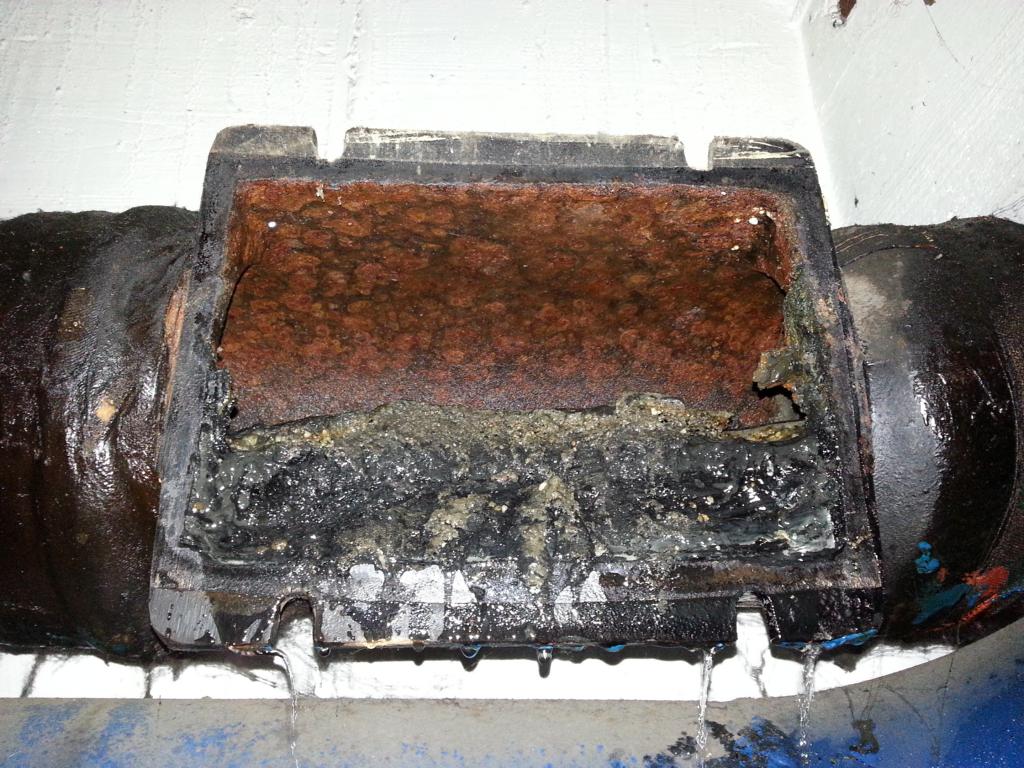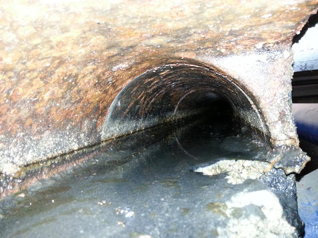 Im linken Bild lässt sich ein stark inkrustiertes Gussrohr von innen erkennen. Wie in diesem Beispiel, kann die alte Gußrohrleitung durch äussere Witterungseinflüsse stark korrodieren und damit undicht werden. Die Folgen können feuchte Wände mit Schimmelbefall und weiteren Schäden in den Wohnungen sein.