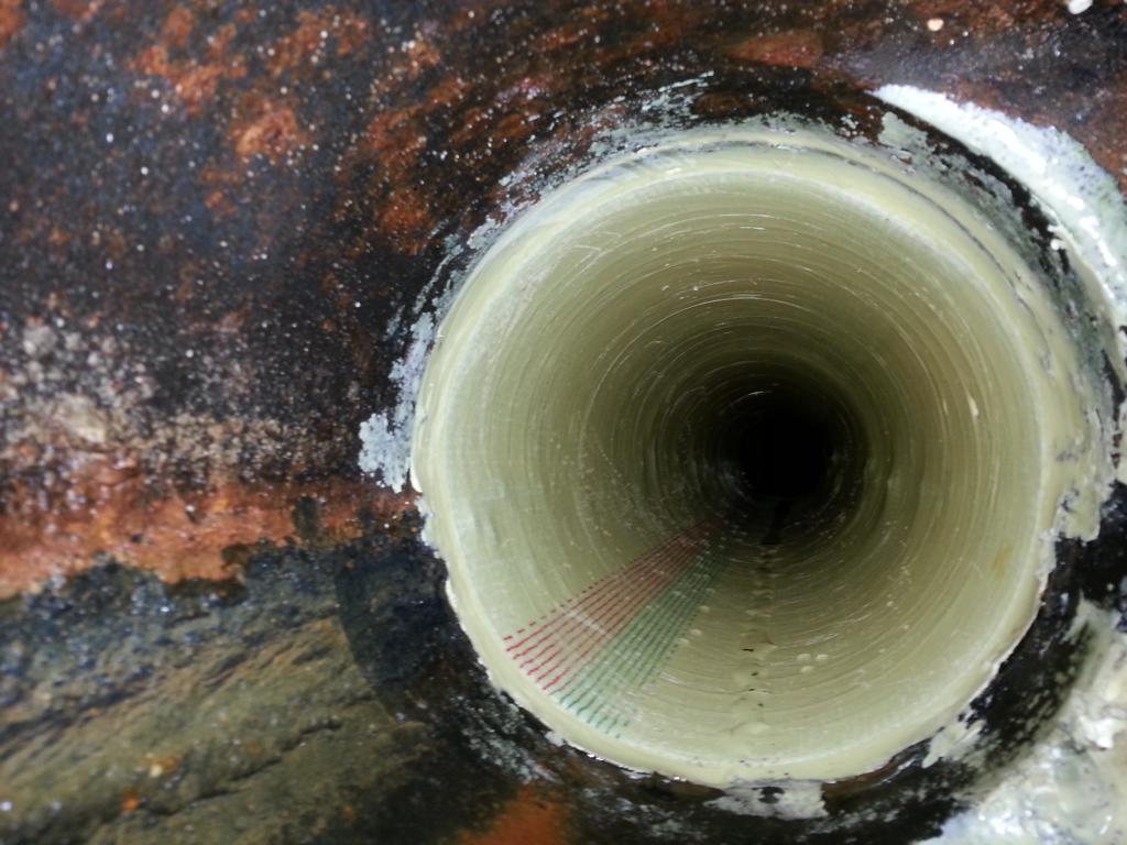 Im rechten Bild wurde über der stark inkrustierten Innenanwandung des Gussrohres im linken Bild ein Inliner angebracht. Wände im Innenbereich sind somit in Zukunft vor Feuchtigkeitsschäden geschützt.