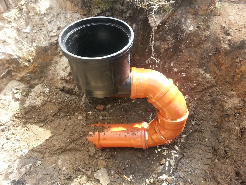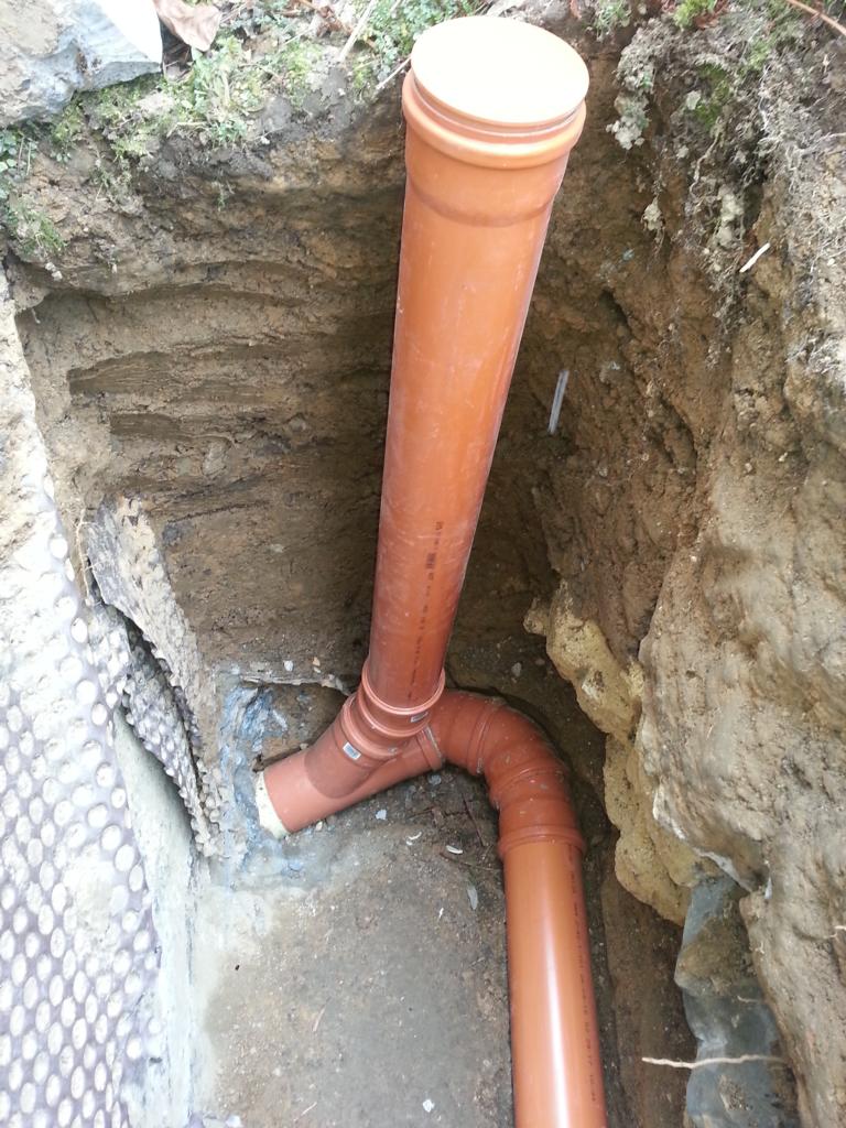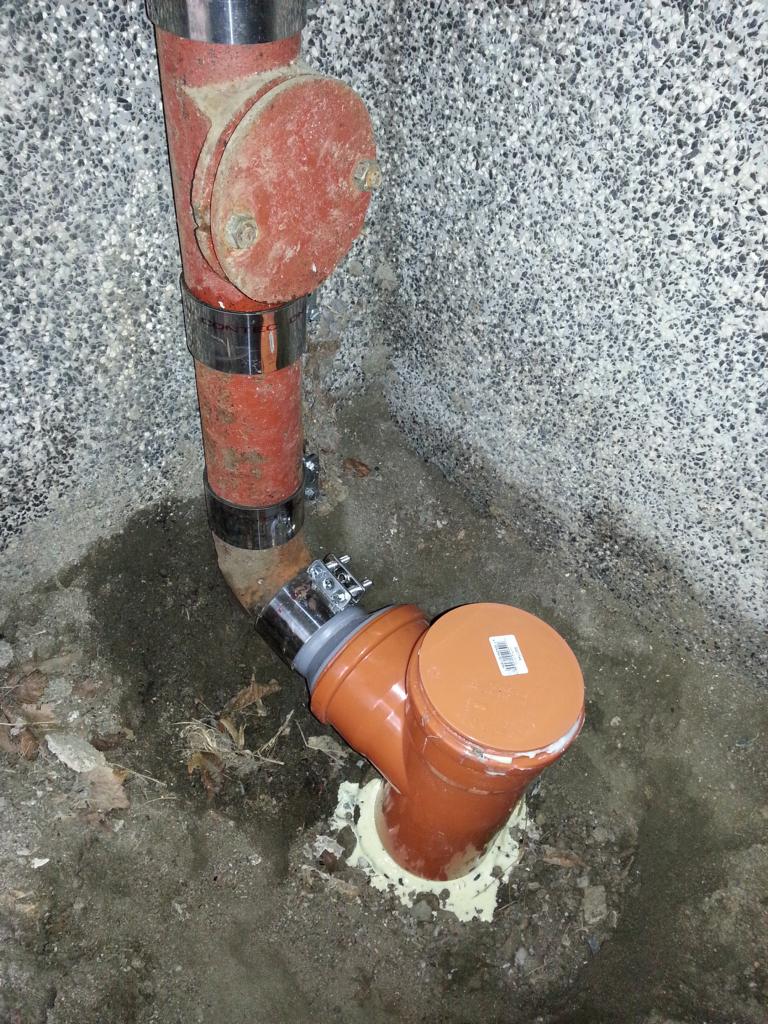 Hier entstand auf Kundenwunsch eine Zusatzrevision unter einem Balkon, wobei auch ein Übergang von KG- Rohr auf Stz- Rohr hergestellt wurde, auf dem Foto gut zu sehen.