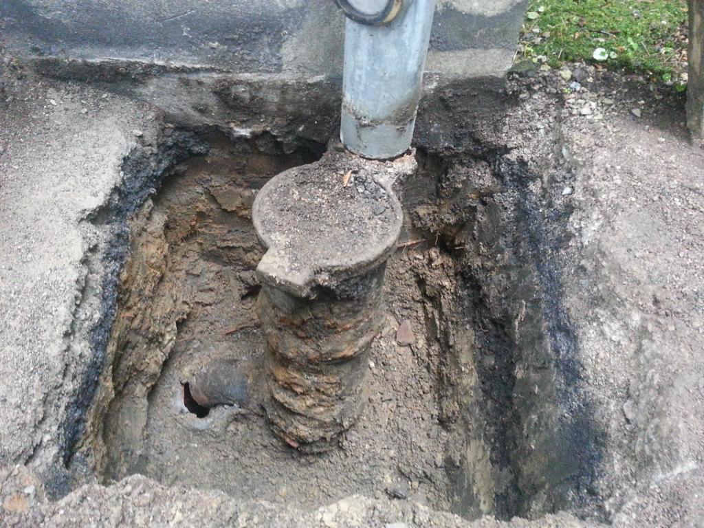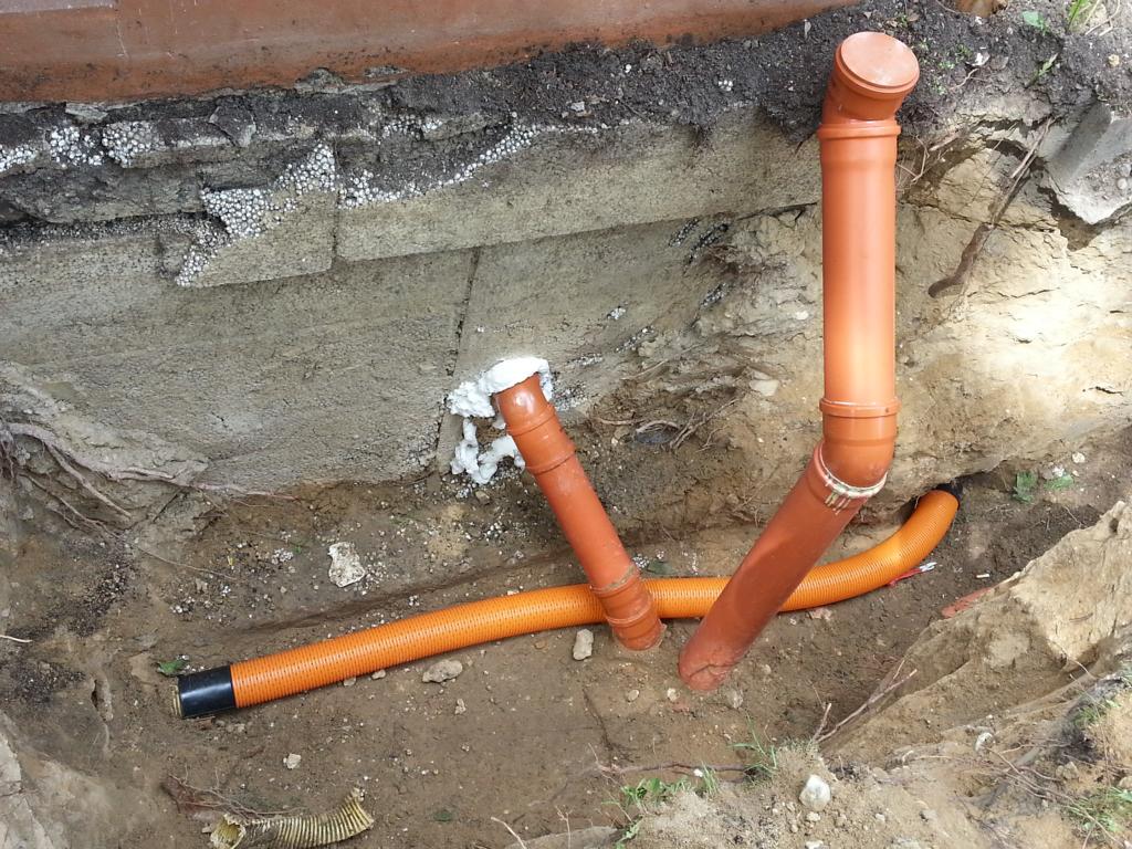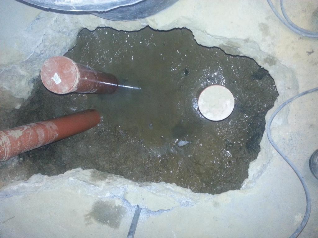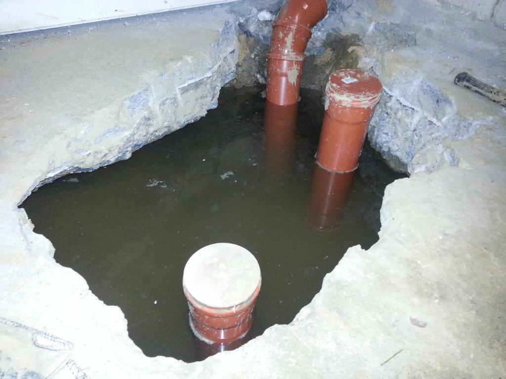 Im unteren Beispiel ist gut zu sehen wie Grundwasser in die Baugrube eindringt. Durch ständiges nachlaufen von Grundwasser, müssen Pumpen eingesetzt werden, die solche Aufgaben nicht leichter machen. Hierbei wurden Abzweige für die Sanierung in beiden Fliessrichtungen eingesetzt und jeweils mit einem Senkrechten Rohr zur Oberflächenhöhe des Kellerbodens angepasst. Diese Vorgehensweise hat zwei Vorteile, zu einem können über weite Strecken Sanierungsarbeiten unabhängig vom Grundwassereinbruch durchgeführt werden (was auch sehr viel Zeit einspart) zum anderen können die an der Oberfläche angepassten Rohre auch nach den Arbeiten auf Wunsch so erhalten bleiben und so als Revision für mögliche spätere Arbeiten genutzt werden. Eine gute Idee um den Kunden bei eventuellen späteren Vorkommnissen durch Zeitersparnis, wie z.B. Rohrreinigungen Kosten einzusparen. Wir nennen das, den Schnüffelrohrtrick.
